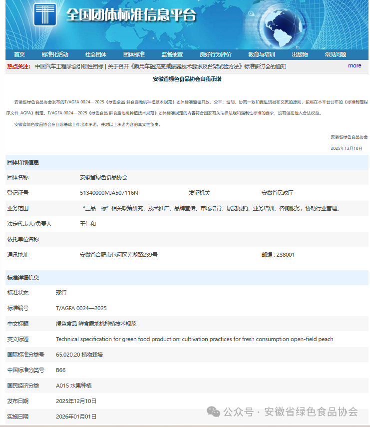 12月10日,安徽省绿色食品协会在全国团体标准信息平台正式发布了《绿色食品 玉米种植技术规范》、《绿色食品 辣椒种植技术规范》、《绿色食品 西瓜种植技术规范》、《绿色食品 鲜食露地桃种植技术规范》、《绿色食品 梨种植技术规范》、《绿色食品 瓜蒌(籽)种植技术规范》、《有机农庄建设规范》、《有机产品大水面养殖技术规范 鲢鳙鱼》、《绿色有机餐厅建设规范》9项团体标准,这些标准将自2026年1月1日起实施。