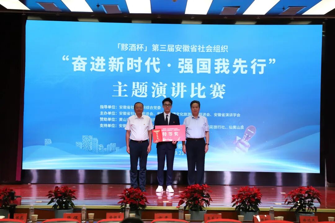 为庆祝新中国成立75周年,9月21日,在省社会组织综合党委的指导下,由省社会组织总会、省健康文化旅游产业促进会和省演讲学会共同主办的“黟酒杯”第三届安徽省社会组织“奋进新时代 强国我先行”主题演讲比赛在合肥举行。本次比赛旨在通过演讲的形式,展现社会组织从业人员的爱国情怀和奋斗精神,激励全省社会组织为实现中华民族伟大复兴的中国梦贡献力量。