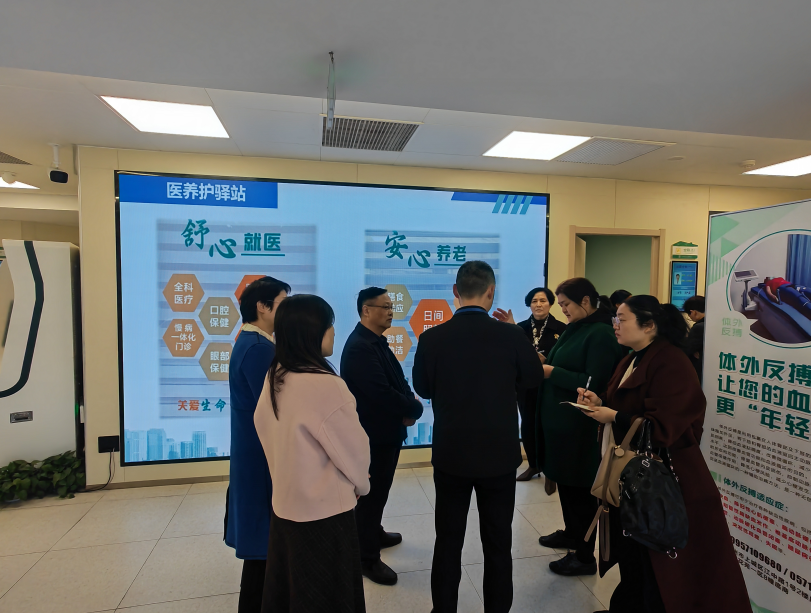 此外,调研组还走进医养结合型养老机构,考察机构内专业护理、康复治疗、认知症照护、慢病管理一体化服务流程,并与入住老人亲切交流。在文新街道医康养服务中心,调研组考察了认知症老人的照护创新做法。就该中心认知症特色专区开展的认知评估、认知训练、娃娃疗法、怀旧疗法等多项非药物疗法进行了深入的交流。